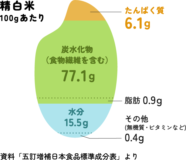 ごはんには、食物繊維と同じ働きをする難消化性デンプン(レジスタントスターチ)が含まれており、便通を助け、腸内環境を整える働きがあります。