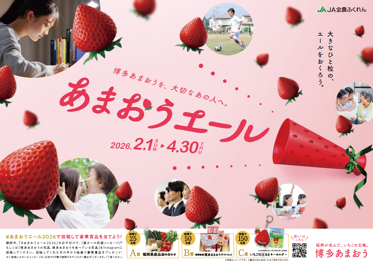 全国農業協同組合連合会福岡県本部(JA全農ふくれん)は、令和8年2月1 日(日)~4月30日(木)まで「あまおうエールキャンペーン」を開催いたします。期間中に#あまおうエール2026を付けて「誰かへの応援メッセージ」または「博多あまおうの写真、博多あまおうを食べている写真」をInstagramに投稿した方の中から抽選で合計270名様に豪華賞品をプレゼントします。